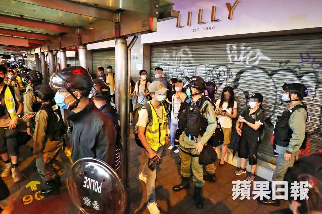 至晚上8時許,有人在彌敦道近始創中心對開大叫「五大訴求、缺一不可」等口號,多輛警車隨即駛至聯合廣場對開巴士站,封鎖一段慢線,大批防暴警下車截查多名途人,並拉起封鎖線,將記者驅趕至十米範圍外,對面康民角休憩處亦有防暴警下車截查,逗留約十分鐘後離開。