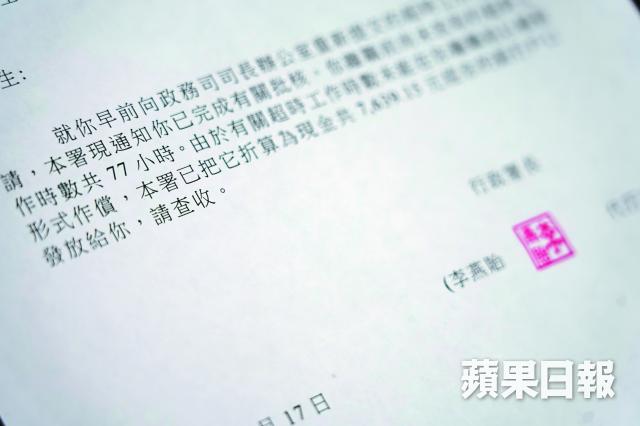 陳共提交累積160小時的加班時數,但行政署上月回覆只批出其中77小時,並以時薪約99元折現支付,信中未交代原因。陳追問署方支薪細項,說明哪些申請不獲批准,但對方以紀錄屬機密為由拒絕。