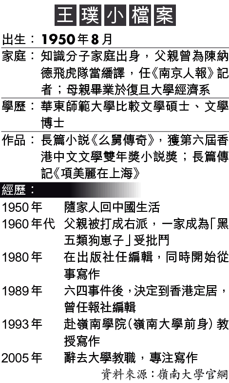 王璞父親為當年抗日戰爭時期頗有名氣的記者,其後重慶大轟炸、日本投降、國共重慶和談均有他的採訪筆迹,其母則畢業於復旦大學經濟系。她可謂出身知識分子家庭。其父抗戰後到香港生活,但在新中國的號召下,選擇回國建設,尚在襁褓之年的王璞立刻變成大陸的新移民。好景不常,其父回國不久,即被打成右派,一家被標籤為「黑五類狗崽子」,日夜生活在被鬥被打的恐懼中。