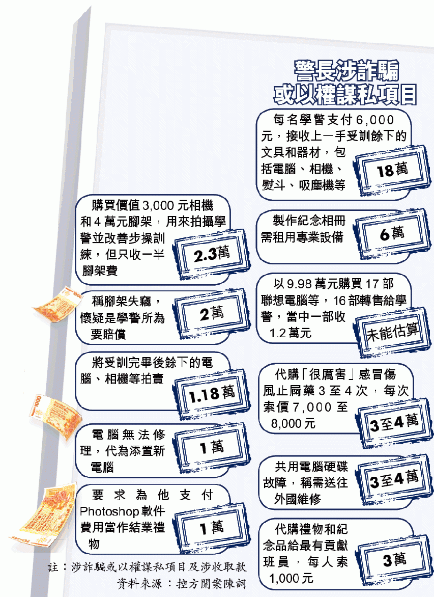 【本報訊】加入警隊32年、在警察學院負責監督受訓警員的警長,涉以權謀私並以威嚇手段欺騙多名學警錢,包括以租用設備製作紀念冊及幫手買電腦為名斂財,又叫學警花8,000元買「很厲害」的傷風止屙藥,還有價值4萬元的腳架。學警唯命是從,事件最終由匿名信踢爆。案件昨於區院開審。
