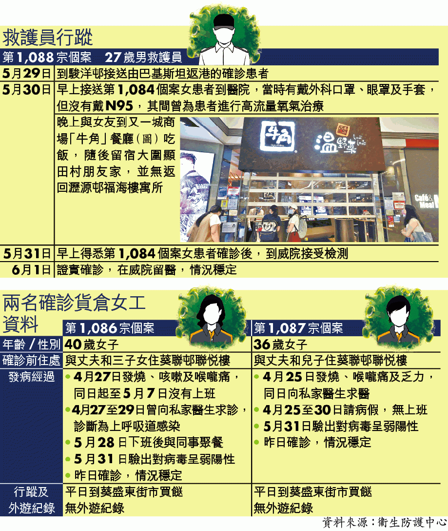 嘉里物流群組至今已增至九人,除了最先確診的一對祿泉樓夫婦,衞生防護中心昨午亦公佈三宗個案,分別為40歲女子(第1,086宗)、36歲女子(第1,087宗)及27歲男子(第1,088宗),前兩者為第1,084宗34歲女患者的嘉里貨倉夜班同事,二人前日已被驗出對病毒呈弱陽性。27歲男子為5月30日參與接送第1,084宗女患者到醫院的救護員。