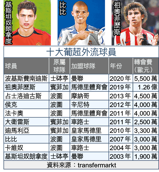 冬季過檔曼聯的中場波基斯費南迪斯,登陸英超後大放異彩,此人正是來自葡超的士砵亭。這個歐洲二級聯賽卧虎藏龍,每個年代都培育過世界級球星,不只基斯坦奴朗拿度及費高這些葡萄牙國腳,迪馬利亞及大衛雷斯等外援也是在此地浸淫作踏板,鯉躍龍門。兩支爭標大熱波圖與賓菲加,人才固然最多,作為歐洲一線聯賽的「供應商」,季後相信又有大批球員離開。