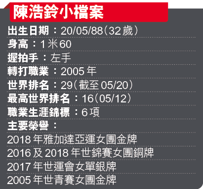 現時世界排名29的陳浩鈴2005年開始轉打職業賽,當中13次殺入決賽並拿下6項錦標。其最後一場賽事是三月在埃及開羅舉行的CIB公開賽,在次圈面對東道主球手Yathreb Adel,以局數1:3見負。陳浩鈴自13歲開始代表香港出賽,曾與歐詠芝、趙家琪及梁善雅奪得世青賽女團金牌。16及18年港隊在女團世錦賽均奪得銅牌,陳浩鈴亦是成員之一,在過去三屆亞運會,她皆收穫獎牌,更在上屆亞運聯同歐詠芝、何子樂和李嘉兒勇奪女子團體賽冠軍。