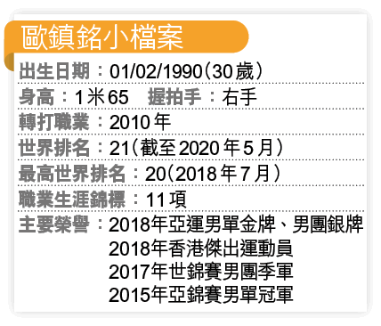 現年30歲的歐鎮銘在2010年7月起轉打職業賽,在同年九月隨即取得首個職業賽冠軍。在近10年的職業生涯中,歐鎮銘出戰344場比賽,取得203場勝仗,拿下11座PSA巡迴賽冠軍,更在18年登上世界排名20。職業賽以外,歐鎮銘亦是近年壁球港隊的領軍人物,為香港造出多個輝煌成績,包括15年亞錦賽男單冠軍、17年世錦賽男團季軍、18年亞運男單金牌及男團銀牌。