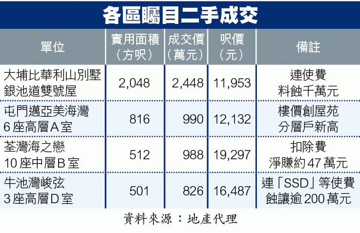 【本報訊】本地再爆發武漢肺炎疫情,港版國安法亦勢在必行,二手市場已連環「見血」。牛池灣峻弦罕見SSD未鬆綁即走個案,女業主持貨一年慘蝕逾200萬元。此外,已結業的泰林電器持有之大埔比華利山別墅一幢洋房,亦大幅蝕讓近1,000萬元易手。