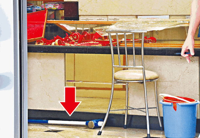 【本報訊】兩名蒙面賊昨晨分別持開山刀及大鐵鎚,闖入屯門一間珠寶金行,用鐵鎚扑爛飾櫃玻璃,掠去一批約值300萬元的金飾後,奪門跳乘由同黨駕駛的接應私家車逃去,前後僅歷時兩分鐘。劫案中無人受傷,屯門警區重案組接手,翻查現場及附近「天眼」,追緝劫匪歸案。