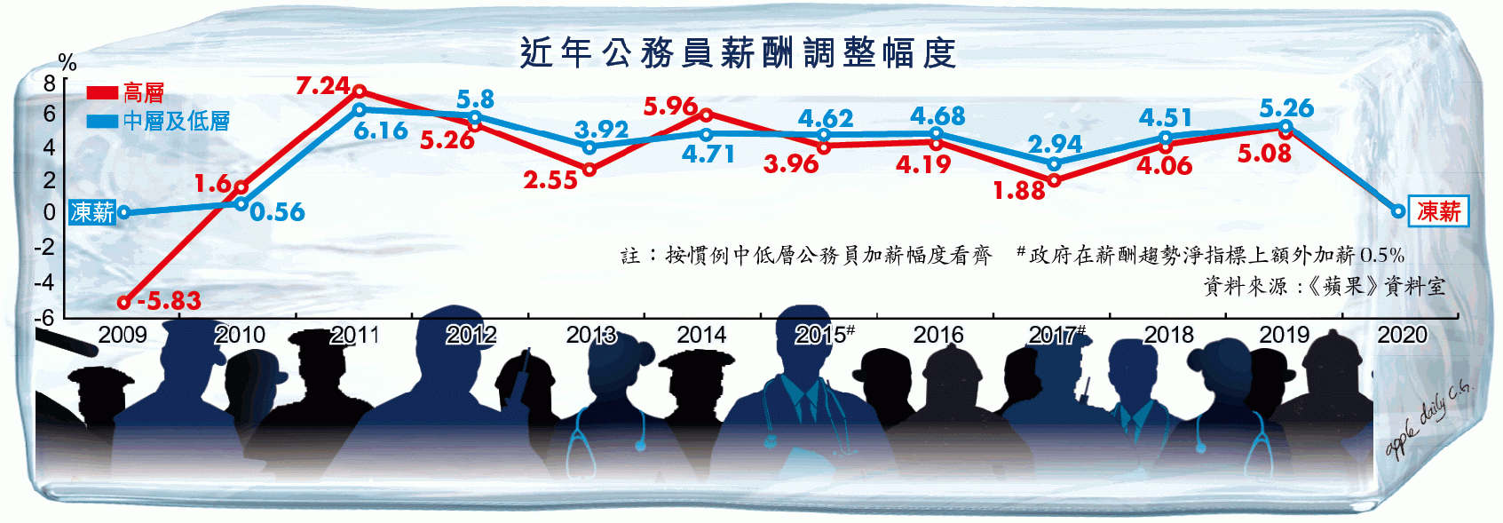 薪酬趨勢調查委員會上月中發表報告,得出薪酬趨勢淨指標為高層1.68%、中層1.98%及低層1.15%。按慣例低層加幅與中層看齊,即原本今年中、低層公務員可望加薪1.98%,高層加薪1.68%。惟行政長官會同行政會議昨審議公務員薪酬調整方案,會後宣佈決定在2020/2021年度凍結全體公務員薪酬,為2009年以來首次;當年中低層公務員凍薪,高層更減薪5.38%。政府稱決定時已考慮多項因素,包括薪酬趨勢淨指標、香港經濟狀況、生活費用變動、政府財政狀況、職方對薪酬調整的要求及公務員士氣等;又指疫情及防疫措施已嚴重干擾本港經濟。