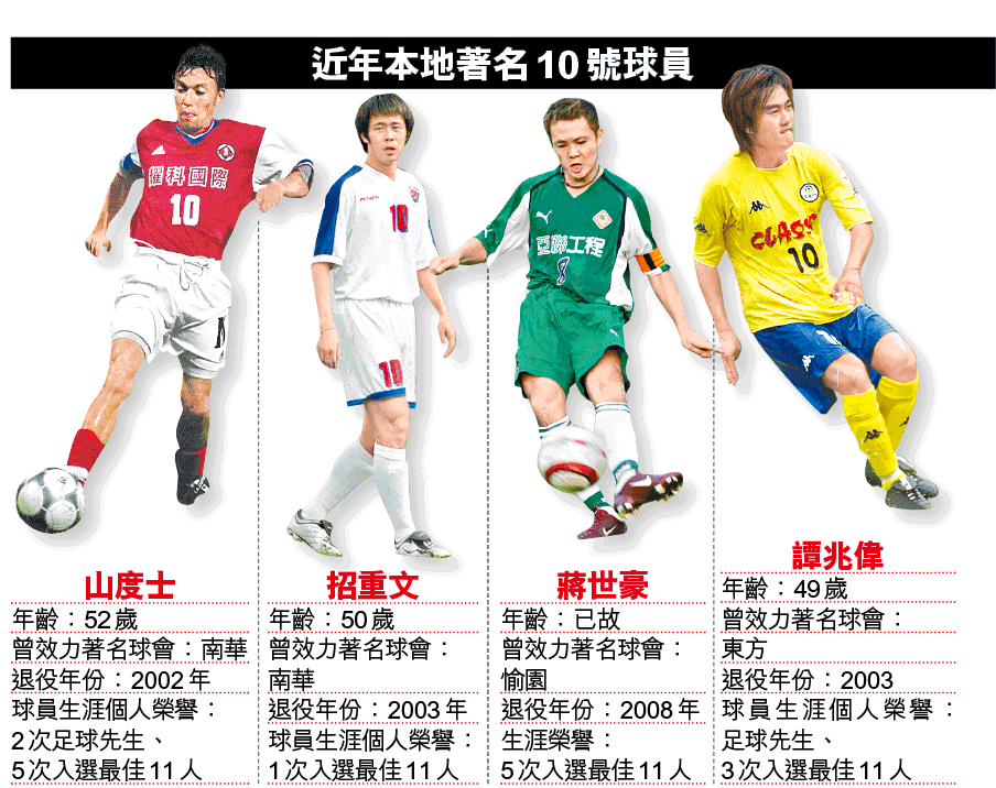不過,現代足球更講求的是效率,着重進攻的傳統攻中似乎沒有太多空間,反而基斯坦奴朗拿度及美斯等擁有極佳突破能力的攻擊球員更為吃香。楊教練指,港超已只餘林嘉緯一名傳統攻中,更令人擔心是青年軍也少有這類型球員,擔心10號在本地球壇消失。「陳俊樂在青年軍時代,技術相當不俗,但在英國學法後踢法有比較大的改變,回來後不是這類型,而近年青年隊也沒有教練發掘出這個位置的球員,比較接近是鄭展龍,但他在夢想FC或傑志較多踢翼鋒,希望快些再有土產10號出現。」他又自言球員生涯難言成就,但選擇留在南華,要與謝利及仙奴等外援爭位,也確實是難事。