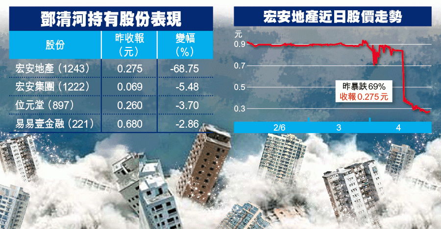 宏安地產股價昨早曾升3.4%至0.91元,下午卻突然斷崖式下挫,一舉跌穿52周低位0.77元,以收市價0.275元計,市值餘下41.8億元,成交額達2.3億元。然而,相比往年的細價股「火燒連環船」,今次殺傷力明顯細得多,多隻宏安系股份只錄單位數跌幅,其中宏安挫5.5%、位元堂跌3.7%、易易壹跌2.9%。