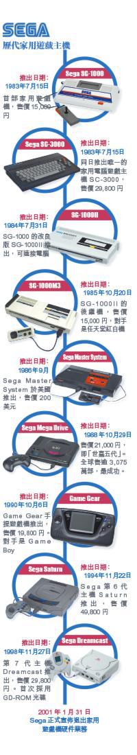 Sega源自美國公司Service Games,40年代專為美軍提供點唱機和老虎機。1953年Service Games將總部遷往日本東京,改名Service Games of Japan。至1960年,「日本娛樂物產」與「日本機械製造」兩公司繼承其業務,推出日本首部點唱機Sega-1000。1965年,取「Service Game」兩個英文字的頭兩個字母,正式改名為Sega,並開始營運遊戲機中心業務,首部全球大熱街機是潛艇遊戲《Periscope》。至1972年,大阪已有31間Sega的遊戲機中心,80年代初開始家用遊戲與主機業務。目前Sega公司資產值440億日圓(約31.2億港元),員工約3,500人。