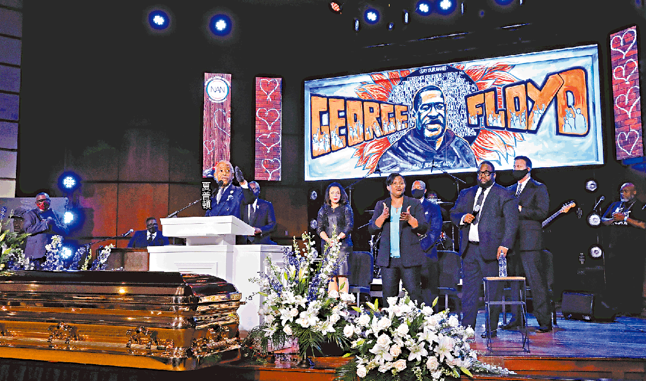 觸發全美國反警暴怒潮的非裔男子弗洛伊德(George Floyd),遭白人警察以膝壓頸死亡後十日,黑人民權領袖夏普頓(Al Sharpton)前日領導追思儀式,矢言不能讓弗洛伊德白白犧牲,要爭取美國司法體系全面改變。