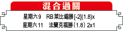 周六德甲力爭來季歐聯入場券的RB萊比錫(白衫),將回到主場迎戰榜尾的柏達邦,主隊上仗作客以4:2擊敗科隆,狀態持續上升。今仗面對上仗慘敗的柏達邦,為保前四位置預計萊比錫將會出盡全力,今仗博「讓球主客和」[-2]的「主勝」。(球賽編號:星期六9;now671及有線652台今日9:30pm直播)