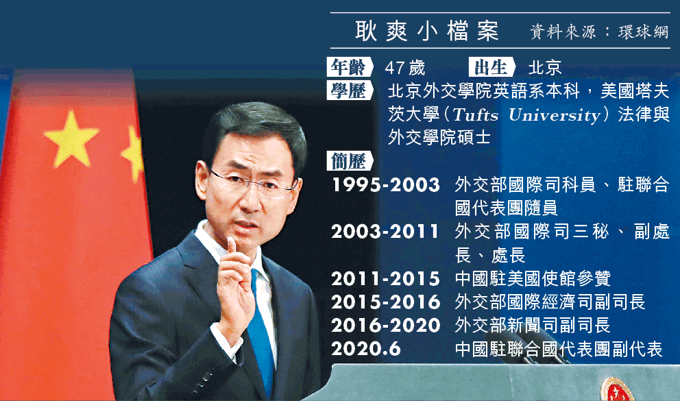 【本報訊】中國外交部發言人耿爽昨日最後一次主持記者會,會上自爆「因工作安排」將辭任發言人。官媒《環球時報》透露耿將往中國常駐聯合國代表團工作,據報他將出任駐聯合國代表團副代表,官升正司局級。耿現為外交部新聞司副司長,任發言人近四年,暫未知誰接任其發言人職位。目前中國外交部有兩位發言人,分別是新聞司長華春瑩、副司長趙立堅。