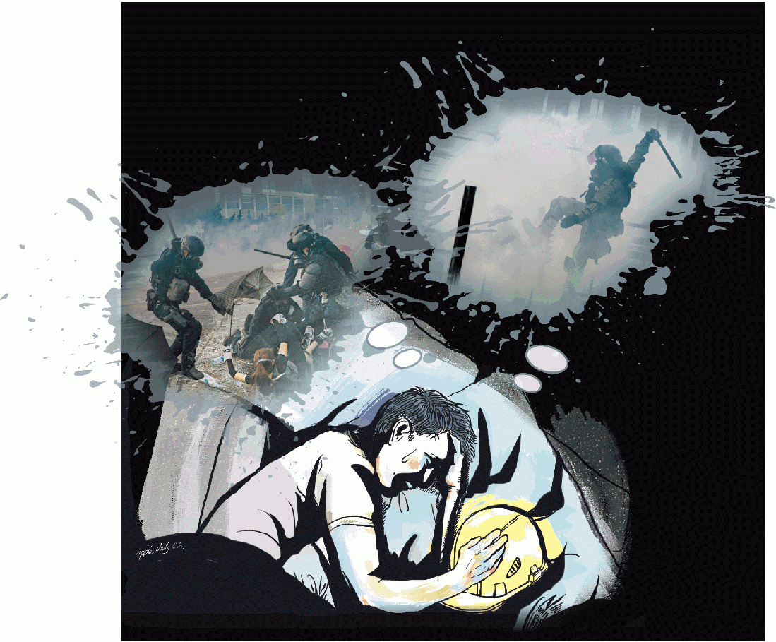 在內疚和自責的背後,換來每晚的夢魘,「發夢見到有spotlight影住自己,另一邊spotlight影住手足跳樓、被強姦,我眼白白睇住但又走唔出個框,咩都做唔到,感覺到痛恨、無力感」。他續說:「有時瞓覺會大叫乍醒,成個人會震,震到醒咗。」他試過持續失眠一整個月,需要服食安眠藥入睡,又試過飲醉後因內心憤怒無法平息,結果咬自己雙手發洩, 「人哋喺自己面前受到傷害,仲大過自己肉體傷害」。他後來向外求助獲安排治療,經診斷後證實患創傷後遺症,需要藥物治療。