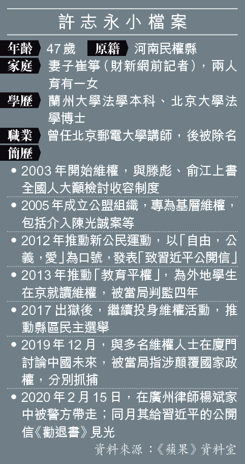 許志永是 「公盟」和「新公民運動」主要創始人,是推動中國公民運動的領軍人,倡導非暴力運動。他於2014年以 「聚眾擾亂公共場所秩序罪」被判四年刑期,出獄後基本被全天候監控。許因在去年12月參加「廈門聚會」後一直逃避中共追捕,武漢肺炎爆發後,他在逃亡中仍發表文章《勸退書》勸告習近平「讓位」,也曾為「吹哨人」李文亮發聲。直至今年月15日在廣州被警方帶走扣查。自由亞洲電台引述知情人士表示,許志永是被人臉識別系統捕捉到,因而被拘。