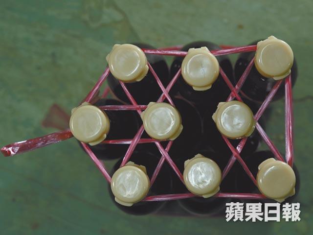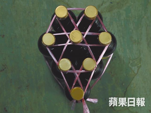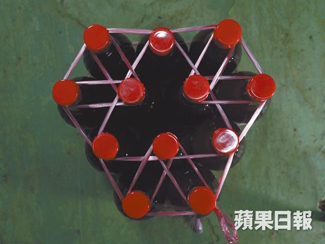 「這門手藝好靚,而我看到當中運用的數學及物理原理,可以說比宇宙更複雜!」包裝一直都是古老的數學問題,好久以前數學家已想找出甚麼包裝方法最好。威哥說七支是最實淨的組合,數學上有個名稱,叫六邊形排列,「利用平面的效率是90.69%,樽與樽之間的空間不到10%,好處當然是盡用空間多擺貨,實際是樽與樽之間緊密不碰撞,團結安全。」細看魔法陣,威哥以三角形為一組來紮樽,三角形之間互相制衡,力量平均分散,也令結構更堅固。當你紮七個以上的樽時,位處中間的玻璃樽,其實沒受惠到樽底尼龍繩的壓力,容易鬆掉。要防止掉樽,樽底尼龍繩紮得好的話,就算打風都打不掉。但若樽的高度不一,弄不出大小一樣的三角形,力會分散,破壞平衡,就會崩壞。在豉油樽中上物理課,萬物含真理,歪理先無處可逃,亂紮,就會爆。聽了一輪物理學解說,威哥繼續埋首紮樽。我們看到他的太極之手下藏着一個宇宙。