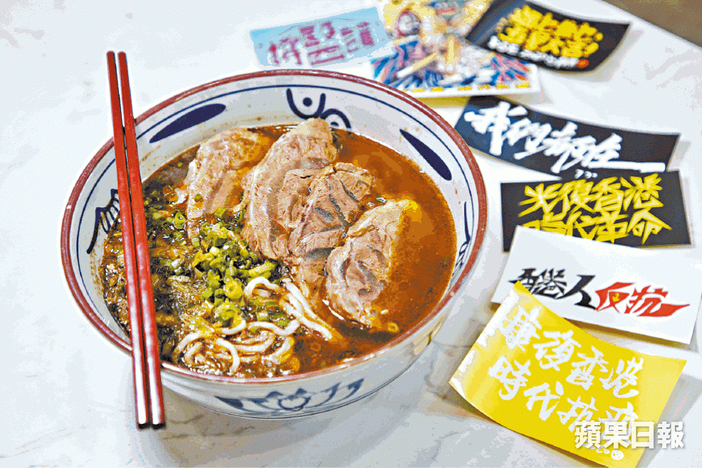 麵店與抗爭運動同生,去年6月開張,陪伴我們走過這段路。當初心黃不說出口,相熟FA提議表態,她才黃到出面,「因為政治就是,你不講就默認,你講了他才是,然後我也很相信這一點。」請了四、五個手足,其中女店員阿西(化名)之前在一間中菜藍店工作,跟這裏最大分別是客人態度,她說:「嗰邊啲客好西,我自然對佢哋好西;呢邊啲客好,我自然對佢哋好。」