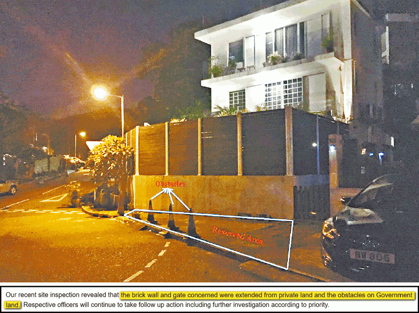 有知情人士向本報提供電郵紀錄,顯示有巿民早於2017年10月已向地政署舉報事件,投訴屋主圍封官地作私人花園及泊車之用,並附上現場照片;地政總署同月回覆投訴人,稱實地視察後確認該屋磚牆及大閘阻礙官地(obstacles on Government land),將調查及跟進,並附上個案編號。不過,違規情況拖延至今未被糾正,前後足足兩年半。