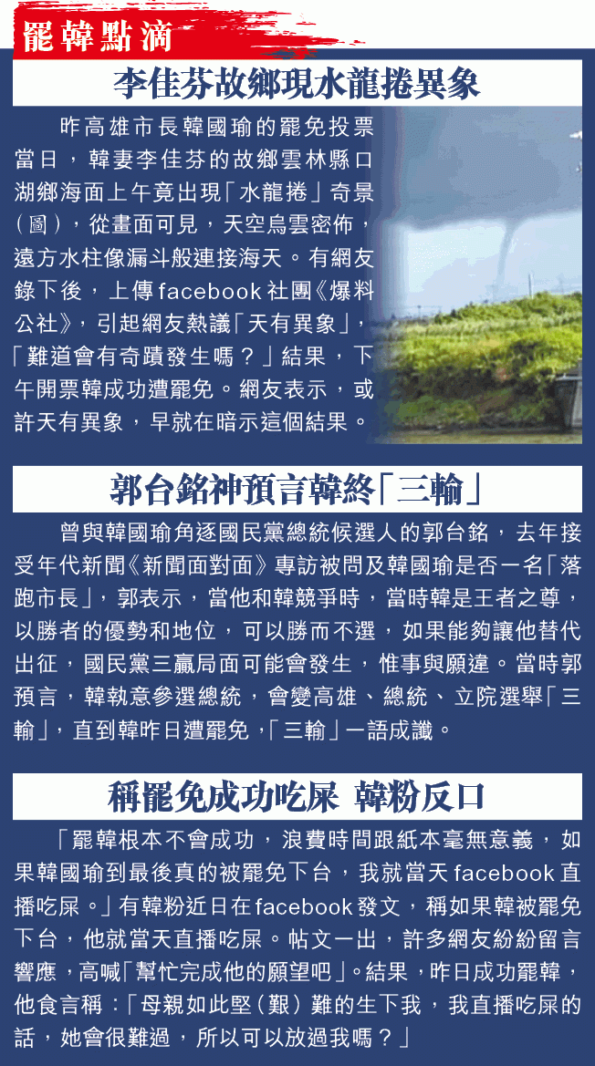 昨日罷韓氣勢一時無兩,發起罷免案的光復高雄總部昨上午8時已封街搭舞台,傳媒搶先進駐,至下午4時投票結束,人潮一波波湧進。在5時11分,同意票壓倒勝超過罷免門檻57萬4,996票時,現場響起戰鼓聲,民眾大喊:「我高雄!我驕傲!」大局已定時,罷韓四君子穿着眾志成城上衣,於下午6時6分現身總部。