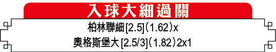 另一場德甲柏林聯主場迎戰史浩克04。兩隊皆是自重啟後未逢一勝,尤以後者更令人失望,停擺結束後四戰全敗,連續11場德甲不勝,進攻火力強差人意,敵「入球大細」的[2.5球]「細」。(球賽編號:星期日7;now670及有線651台今日9:30pm直播)