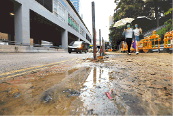 本報記者昨午在牛頭角地鐵站對出、近觀塘道往藍田方向的行人路所見,一段約三米長的行人路上,約百塊「黏合地磚」隆起。翠屏道近觀塘泳池對開一段約兩米乘兩米行人路,亦有逾百塊地磚夾雜黃泥水四散,露出沙地,路政署已圍封受影響範圍,有待修補重填。另外,觀塘區議員梁翊婷在fb發佈相片,亦顯示區內有行人路出現大範圍「黏合地磚」損毀情況。