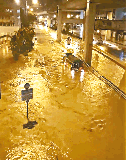 【本報訊】一道低壓槽帶來惡劣天氣,昨凌晨全港雷雨交加,暴雨警告信號在兩個多小時內「三級跳」,黃變紅再變黑,是三年來首個黑色暴雨,傾盆大雨持續近三小時,廣泛地區水浸,道路如激流車輛死火,重災區觀塘變水塘,有小巴被淹浸,乘客頻呼「救命」要由消防員救走。多處行人路亦有大量以膠水黏合的地磚被大水沖散隆起,專家質疑「黏合地磚」阻礙磚與磚之間縫隙去水,是導致水浸加劇原因。