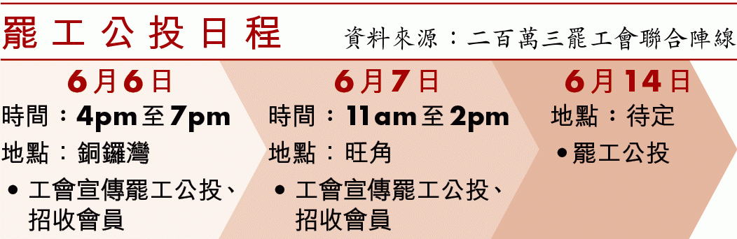 【本報訊】港版國安法最快本月中公佈實施,工會及學生組織號召罷工及罷課對抗惡法。23個工會組成的聯合陣線聯同中學生行動籌備平台計劃本月14日進行公投,若獲六成投票的打工仔及學生支持,將發動全港跨行業的大罷工與全港學生罷課。參與的工會包括公務員工會、巴士公會及航空業工會。