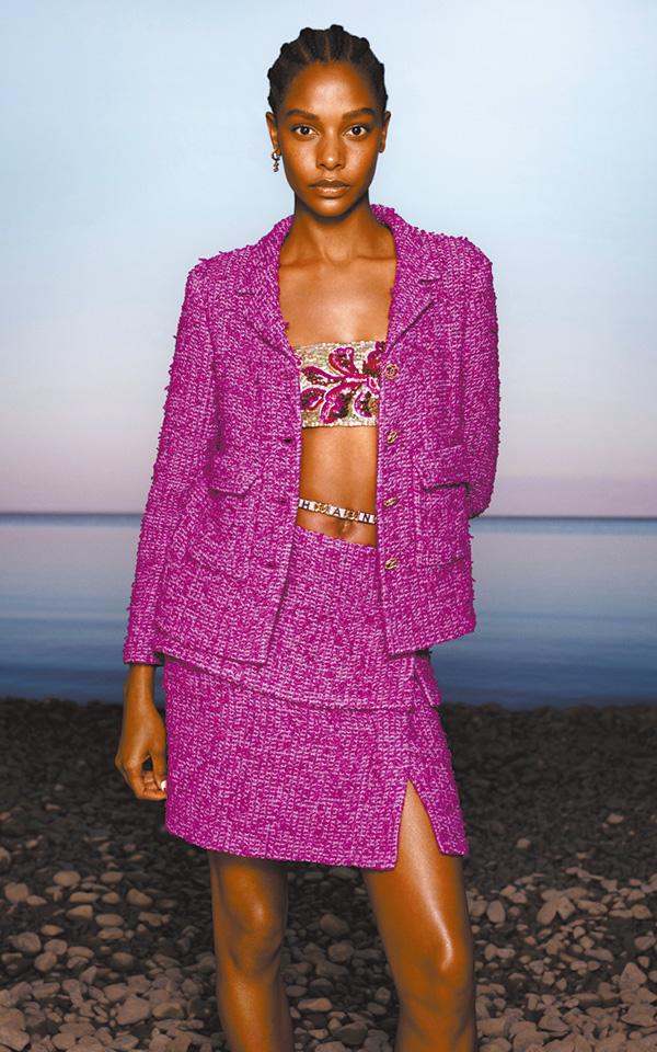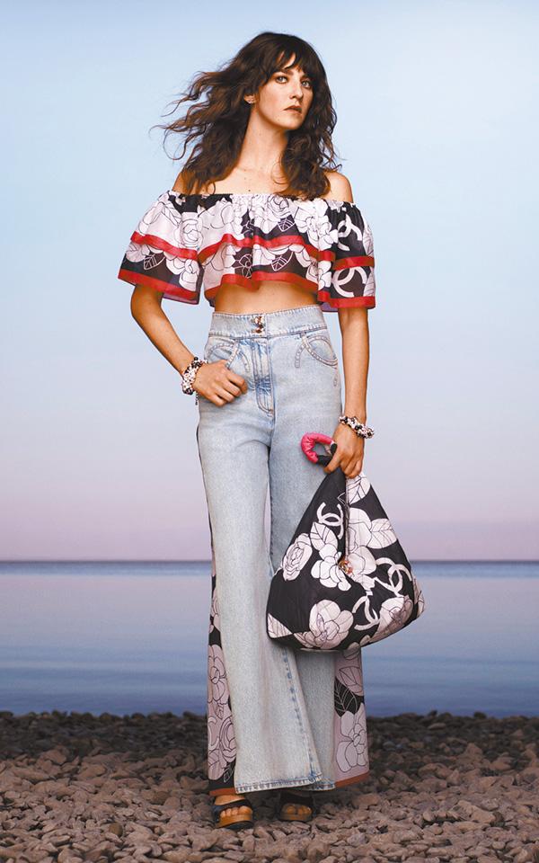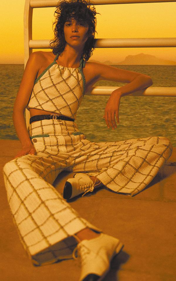 計劃不似預期,靈活變化出的新概念,請想像60年代電影女星去地中海,在大海與島嶼、尤加利樹環抱下,寫意度假。海邊風情的奢華珠片比堅尼、cropped top,搭配招牌呢絨套裝,有品位的自在格調。泳裝one-piece剪裁的連身褲,腰間縛上輕便CC chain belt;隨意爽快的露腰上衣、綁帶top配高腰喇叭褲。牛仔褲加入tweed detail,撞上粗獷銀頸鏈,帥氣!金銀織物連身裙就像海岸邊日落餘暉的金光,滲出浪漫想像。