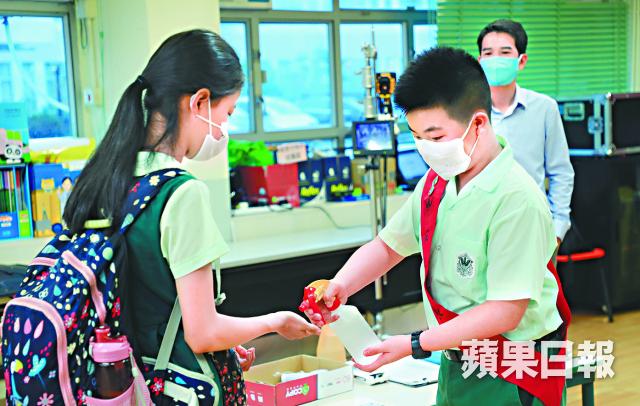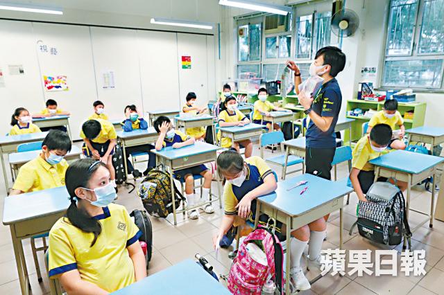 校方對每項防疫程序都一絲不苟,但學生偶有鬆懈。本報到訪黃大仙福德學校課室直擊首天復課情況,不少小四生上課期間不時拉下口罩「唞氣」,或隔着口罩擦鼻揉臉;至於首個小息,女生聯袂去洗手間,並沒有維持「社交距離」;課室內脫下口罩吃小食前,有不少學生忘記先清潔雙手;聚在一起邊聊天,邊飲水,有學生甚至拉下口罩至下巴。