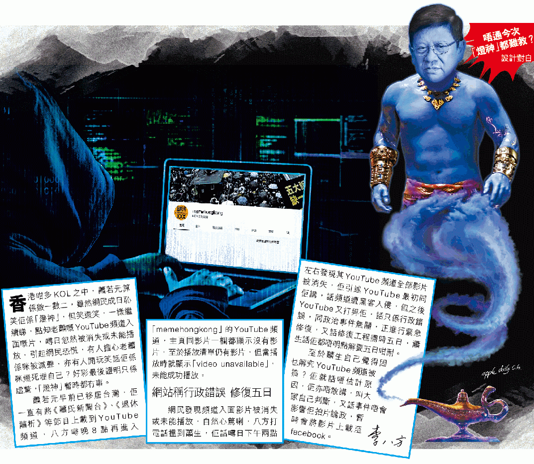 香港咁多KOL之中,蕭若元算係數一數二,雖然網民成日恥笑佢係「燈神」,但笑還笑,一樣繼續睇,點知老蕭嘅YouTube頻道入面嘅片,噚日忽然被消失或未能播放,引起網民恐慌,有人擔心老蕭係咪被滅聲、亦有人開玩笑話佢係咪燈死埋自己?好彩最後證明只係虛驚,「燈神」暫時都冇事。