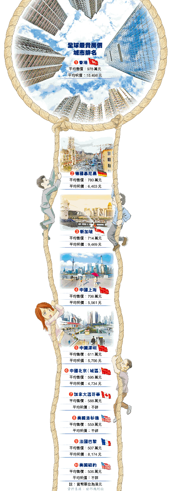 報告指出,去年全球住宅價格最高十大城市中,半數位於亞洲。其中,香港經濟雖然面對衰退,整體住宅成交量下跌3%,但樓價持續攀升近5%。