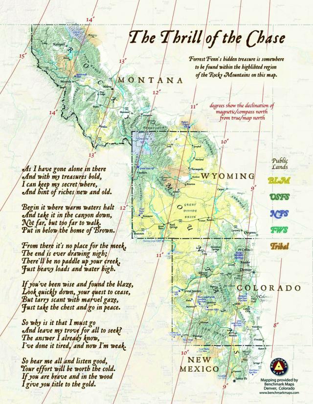 89歲的收藏家芬恩(Forest Fenn)前日表示,一名來自東部的男子數日前發現寶藏,收到對方發送的一張照片確認。他指不認識該名男子,稱對方是透過他在2010年出版的自傳《The Thrill of the Chase:A Memoir》中的24行詩找到線索。
