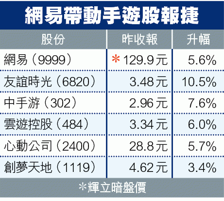去年底上市的阿里巴巴(9988)盤中一度較美股見溢價2%,故梁預期網易上市日,股價亦有機會炒至較美股為高,「但又唔會超好多,因差價太大都會吸引投資者轉炒美股」。截至昨晚10時,網易美股股價414.16元,折算港股128.4元,較港股招股價123元溢價4.39%。受惠同業招股反應熱烈,手遊股炒上,中手游(302)漲7.6%至2.96元;創夢天地(1119)升3.4%,報4.62元;友誼時光(6820)升10.5%至3.48元,創三年高位。
