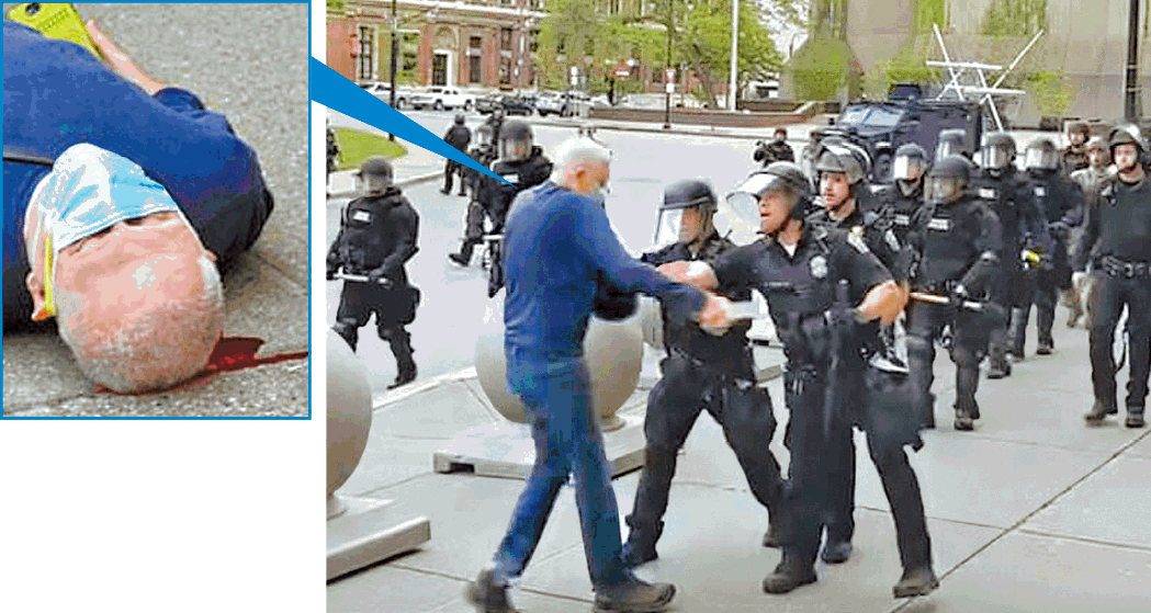 有片段拍到75歲老翁古吉諾(Martin Gugino)上周在水牛城示威期間被警員推跌,頭部着地流血,涉事警員無理會。當局起訴涉事警員二級襲擊罪,一旦罪成可判囚七年。特朗普前日在Twitter引述極右「一個美國新聞網」(OANN)的陰謀論,「被水牛城警察推倒的示威者,可能是反法西斯組織的內奸。75歲的古吉諾似乎在偵測警方通訊、企圖令設備失效後才被推開。我看了OANN的報道,他跌得重過被推,他目標是偵測通訊。這會否是圈套?」但專家稱,特朗普講法在技術上難以理解,警察無線電只會在接收站受破壞時才會截斷通訊。