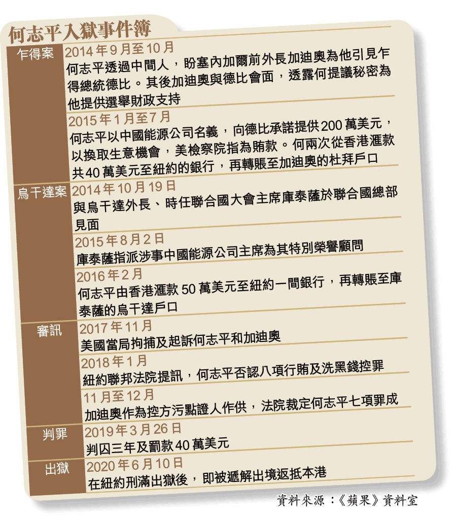 何志平2017年11月在紐約被捕,控罪指他賄賂非洲國家乍得總統及烏干達的外長,以換取中國華信能源公司獲取開採石油的權益。他被落案控告八項控罪,包括五項違反《海外反腐敗法》罪名及三項洗黑錢罪,其中七罪成立,去年3月被判監禁三年及罰款40萬美元(約314萬港元)。由被捕、入獄至出獄,他已被關押31個月,因「行為良好」提早獲釋。何志平就此案的上訴申請已於今年3月中獲法庭審理,但未有結果。