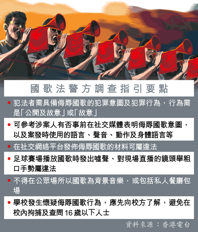 指引以球賽期間的演奏國歌時間為例,指若有人在現場發出噓聲或在直播鏡頭高舉粗口手勢,行為或已觸犯國歌法。若在公開演唱國歌時走音或唱錯歌詞,則需證明涉事人是有意侮辱國家而「公開及故意」所作出的行為。但執法指引沒有提及禁止使用國歌作電話鈴聲,亦沒禁止在街頭演唱國歌。