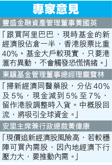 豐盛金融資產管理董事黃國英指,大市略為調整,故昨跟買阿里,現時基金的新經濟股佔倉一半;基金的香港股票比重為40%,與美股相若。他稱基金大戶較現實,若未見有新的壞消息傳出,只要港滙無異動,都不會觸發恐慌情緒,「要我驚都要做啲動作,大前提係郁個滙市」,除非美國落實抵制中國,股市才會跌。港股炒作波幅較美股小,因此預期走勢反覆向下而非「高台跳水」,料波幅徘徊23000至24000點。
