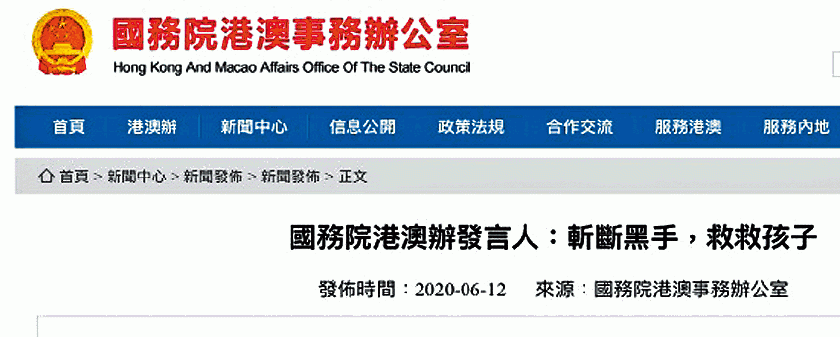 港澳辦昨發稿,批評有人「把黑手伸向學校,伸向未成年人,搞所謂中學生罷課行動」,企圖把學生當作阻止立法的「炮彈和工具」,用心歹毒,行為卑劣:「香港眾志以及黃之鋒、鄭家朗之流是在為自己的罪行錄上再添下重重的一筆。」