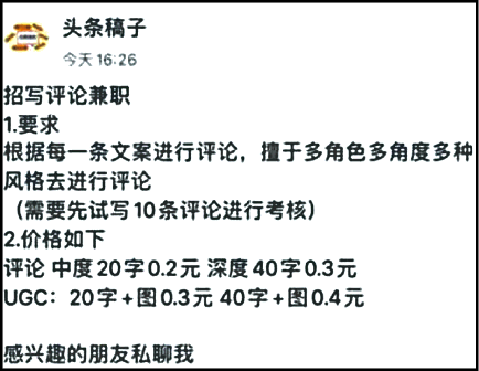 微博「頭條稿子」近日招聘「評論兼職」,工作內容是「根據每一條文案進行評論」,並要求應徵者「擅於多角色、多角度、多種風格去進行評論」,還需要先寫出10條評論供考核。而酬勞則為「中度20字」評論0.2元、「深度40字」0.3元,附圖則再加0.1元。惟今年4月,有網軍分享收入清單顯示,每則評論為0.7元,網民一度揚言今後可改稱「七毛」。