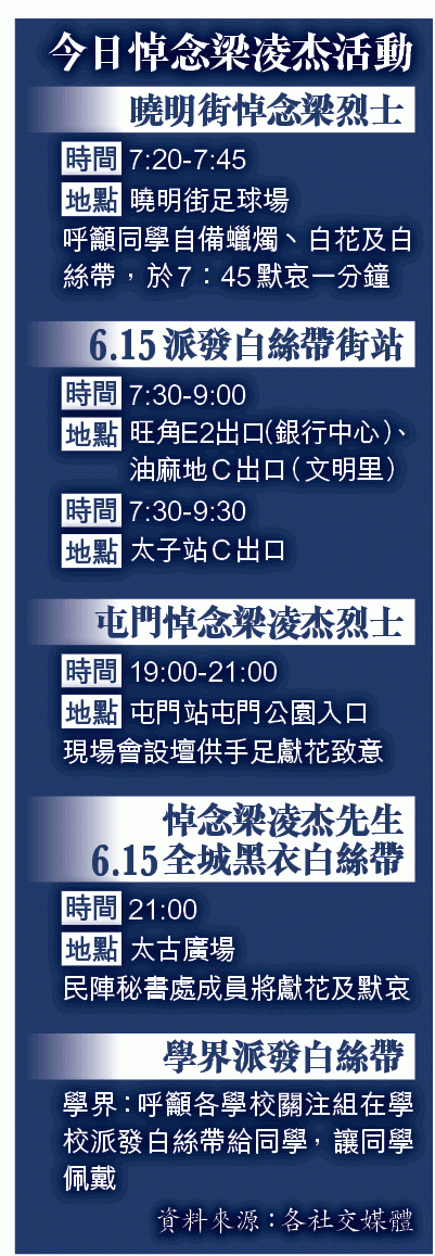 學界方面,中學生連線呼籲各學校關注組在學校派發白絲帶給同學,讓同學返校佩戴。副主席阿恆表示,期望藉悼念重燃學界士氣,令沉寂良久的學生再度關注社會發生的事。由三間中學組成的「曉明街中學聯盟」更加會安排早上在觀塘曉明街足球場悼念,聯盟已經預計會有藍絲挑釁及警察干預,呼籲參加者保持冷靜。