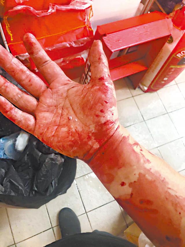 【本報訊】黃店近月不斷被搗亂,東主甚至成為襲擊目標。水門泰式雞飯專門店東主前晚在屯門分店打點期間,突然被四名惡煞持棍襲擊,頭破血流送院治理,東主事後在facebook上載「血掌」圖片,並懸紅50萬元追尋四名兇徒,警方將案件列作襲擊致造成實際身體傷害,暫未有人被捕。