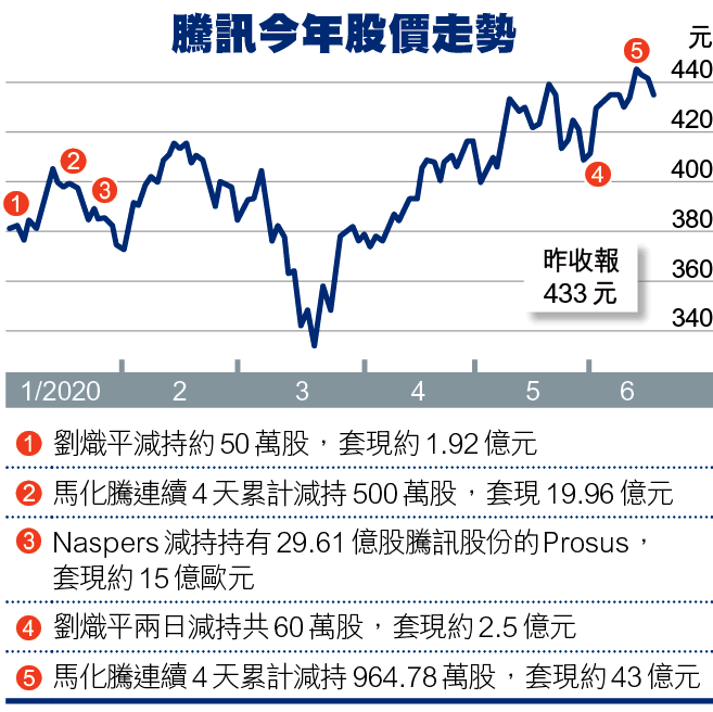 今次出貨價最高達455.2元,四個交易日平均價約442.57元,今次沽貨金額是2016年7月以來新高,套現近42.7億元。騰訊發言人回覆本報指,馬化騰減持為個人財務安排。