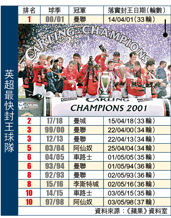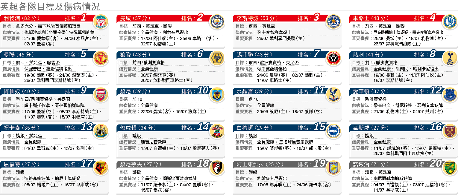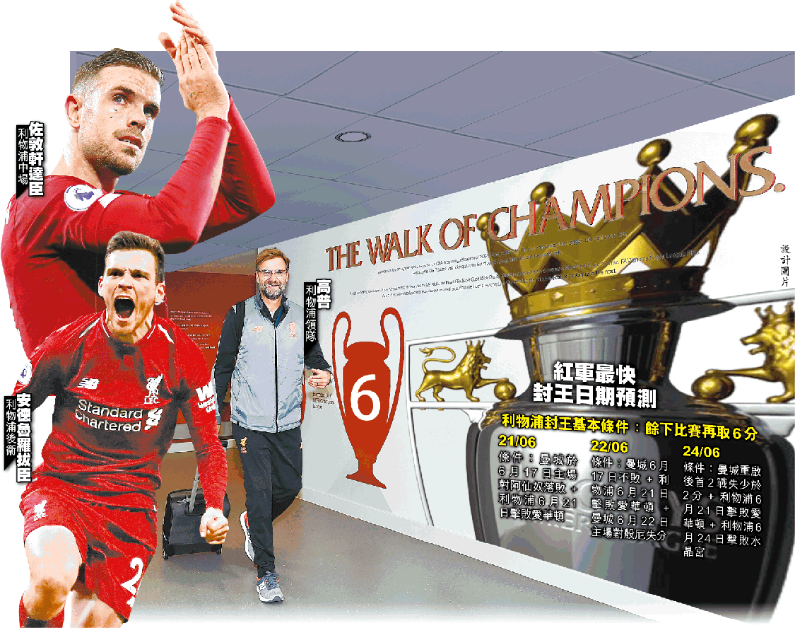 按照目前形勢,如少踢一場的曼城在周三復季第一擊不敵阿仙奴,利物浦只要在下周日打吡戰擊敗愛華頓,便可鎖定錦標。就算曼城成功擊敗阿仙奴,紅軍最快也可望於下周三主場對水晶宮之戰封王。
