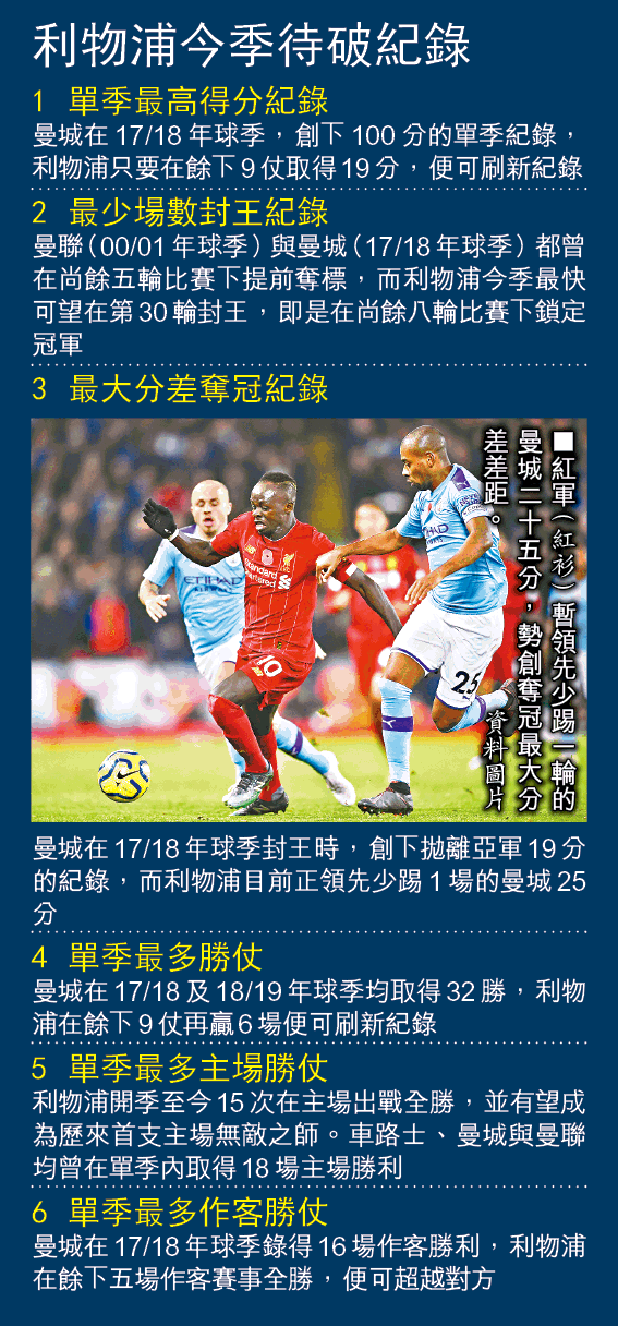 儘管無法成為歷來最早加冕的英超冠軍,甚至幾乎肯定會成為聯賽史上最遲奪冠的球隊,但其實利物浦今季仍有六大紀錄等着他們打破,包括單季最高得分、全季最多勝仗、最多主場勝仗、最多作客勝仗、最少場數封王,以及最大分差奪冠紀錄(見附表)。高普亦表明利物浦在復季後會「踩盡油」,力爭在餘下9仗全取27分,就算能提前封王也不會放軟手腳:「我們還未正式奪冠!我們已很接近,但接近即是還沒完成。目前還有27分可爭,我們一定會全力盡攬。」紅軍左閘安德魯羅拔臣則表示,賽會已有一系列可靠措施防止球員受感染,他期望復季能助國民走出陰霾:「英超一直致力確保一切順利,並滿足各方要求,我們至今做得非常好,球迷很快便可透過電視觀看球賽,這將是對國民的一大鼓舞。」