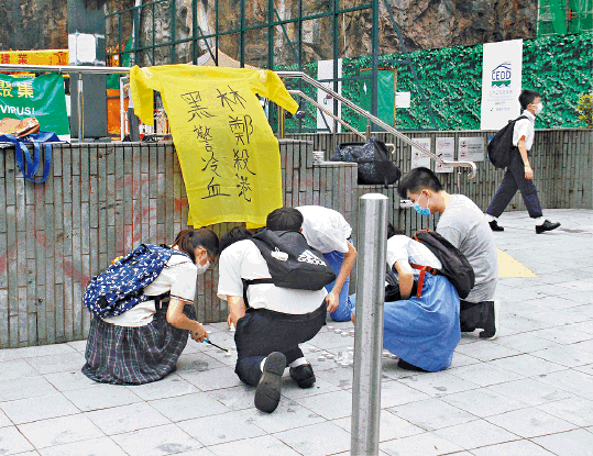 去年6月15日,梁凌杰穿着背上寫有「林鄭殺港 黑警冷血」的黃色雨衣,在金鐘太古廣場墮樓身亡,學生們昨日亦在球場掛起兩件黃色雨褸,展示梁凌杰雨衣上的同一字句。