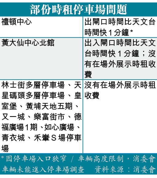 消委會又發現,黃大仙中心北館停車場出入閘口,以及禮頓中心停車場的出閘口的時間比天文台時間快一分鐘,可能令「準時」駕駛者多付一小時泊車費。有14個停車場並無設置停車場已爆滿的提示,導致駕駛者入閘後計時收費期間,會浪費等候車位的時間和費用。