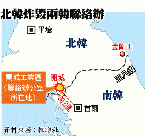 朝鮮半島局勢再次回到國際社會的視線,北韓領袖金正恩胞妹金與正預告位於當地開城市的南北韓聯絡辦公室即將「完全崩潰」後三日,這幢四層高大樓就被北韓炸毀,象徵兩國關係跌至近年冰點。南韓警告若北韓繼續撥火,他們會嚴厲回應。
