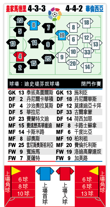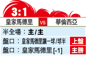 加上該隊多名守將加雷、基比爾包列斯達及基斯坦奴比斯尼傷缺,縱使比皇馬休息多兩日,但皇馬接連主場出擊,加上兵源充足不怕踢得密,實力、狀態明顯佔優之下,皇馬讓一球/球半照捧上盤。