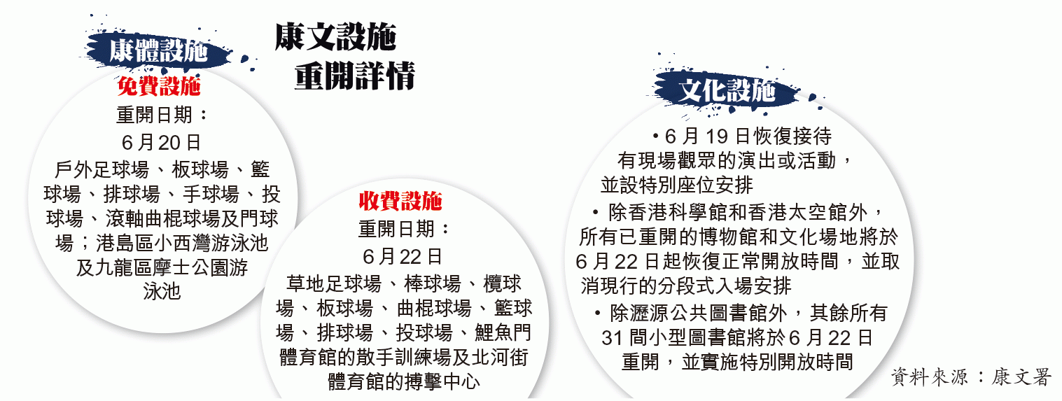康文署宣佈,由本周六起,戶外足球場、板球場、籃球場、排球場、手球場、投球場、滾軸曲棍球場及門球場等免費康樂設施將重新開放,港島區小西灣游泳池及九龍區摩士公園游泳池亦會於同日重新開放。重新開放的游泳池的開放時間由每日上午6時30分至晚上10時,當中分三節時段開放,兩節時段之間會有休池時間。