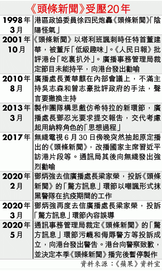 由1989年起,港台節目《頭條新聞》以嬉笑怒罵形式,將古今荒謬事盡付笑談中,昨日是節目今季最後一集拍攝,明日播出後,需就通訊管理局裁決檢討,復播無期。主持吳志森及曾志豪笑談之間流露不捨,「後會有期,咁大嘅大話你叫哀家點講得出呢?」